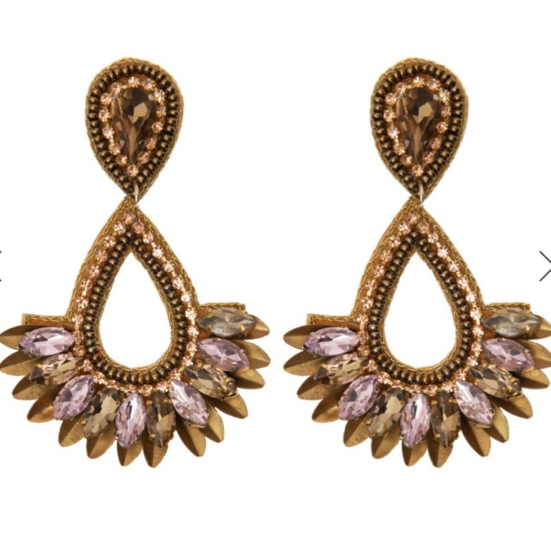 Pendiente en gota con gajos dorados y cristales. Hecho a mano. Cierre a presión.